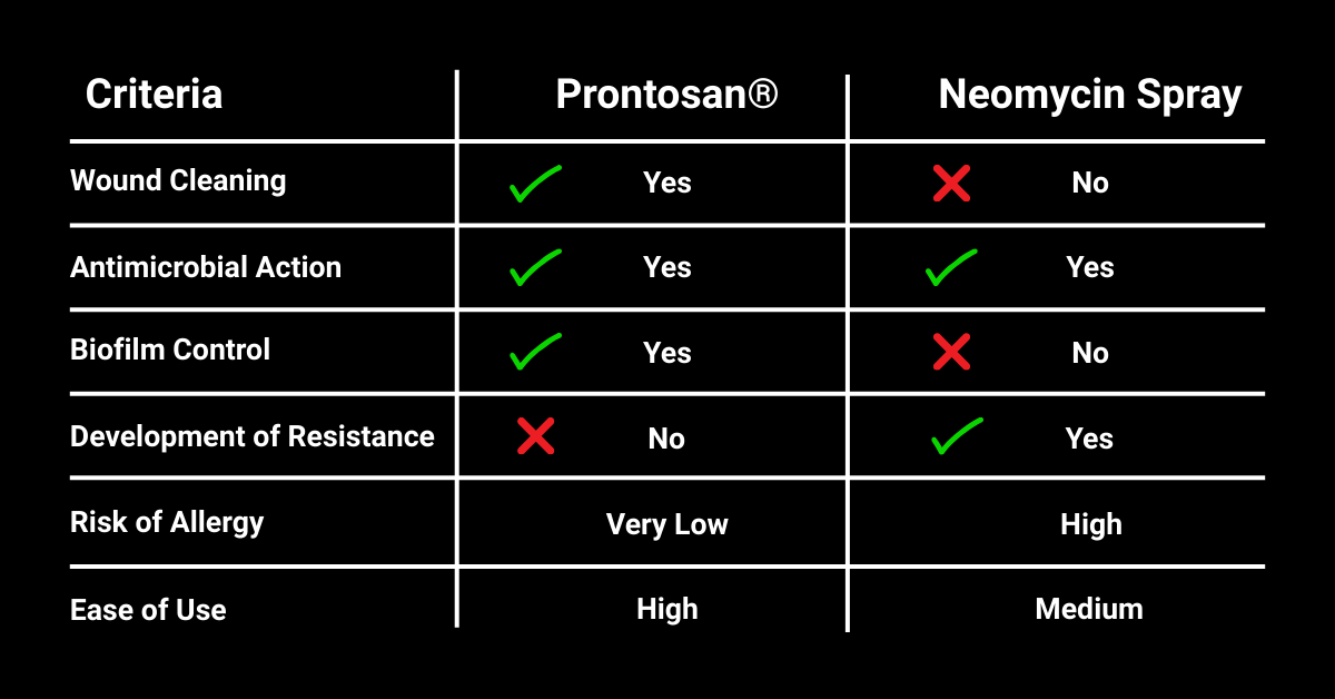Sammansättningen och verkningsmekanismen för dessa två produkter skiljer sig avsevärt. Prontosan innehåller polyhexametylenbiguanid (PHMB) och betaglukan, kombinerat med ett kraftfullt rengöringssystem (monopropylenglykol). Det är specifikt utformat för rengöring, desinficering och borttagning av biofilm från sårytor. Å andra sidan innehåller neomycinspray ett traditionellt bredspektrumantibiotikum som främst riktar sig mot bakterieinfektioner. Prontosan ger inte bara antimikrobiell verkan utan bryter även ner biofilmen och rengör effektivt såret, vilket förbättrar den läkande mikromiljön och förhindrar potentiella infektioner.
